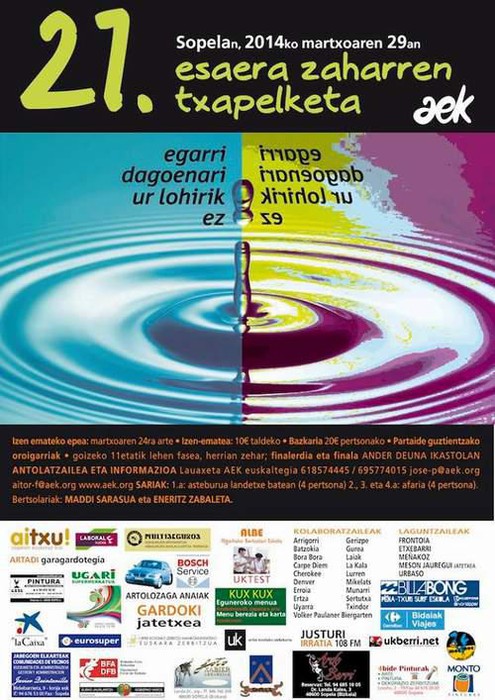Martiaren 29an helduko da Sopelako eta eskualdeko euskaltzaleon jai handia, Esaera Zaharren Txapelketea. Sopelako AEK-k antolatuta, aurtengoa XXI. edizinoa izango da, eta hau da hautatu daben leloa: Egarri dagoenari... ur lohirik ez!. Izena emoteko azken eguna martiaren 24a izango da.