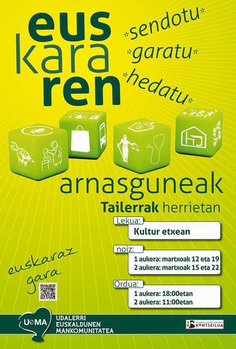 2014-03-10 13:35 Euskerea berbagaiArnasguneek euskerearen normalizazino prozesuan daben garrantziaren jaube izanik eta, aldi berean, gune geografiko euskaldunetan atzemon dan distensino eta kontzientziazino falteak sortutako ardureaz jaubetuta, horreetan eragiteko asmoz, arnasguneen tailerrak diseinau ditue Kontseilua, Bertsozale, EHE, Emun, Topagunea eta UEMA erakundeek.