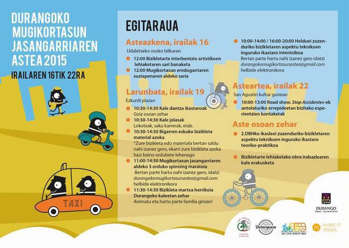 Aurreko urteetan legez, oraingo honetan be, kutsadurarik sortzen ez dauen mobikortasun ereduaren alde egingo dabe Durangon. Irailaren 16tik 22ra bitartean egingo da Mobikortasun Jasangarriaren Astea. Jolasak, tailerrak, azokak eta bizikleta martxea egongo dira, besteak beste. Durangoko Udalagaz batera, herriko beste eragile ugarik be parte hartuko dabe, txirrindularitza taldeek esate baterako.