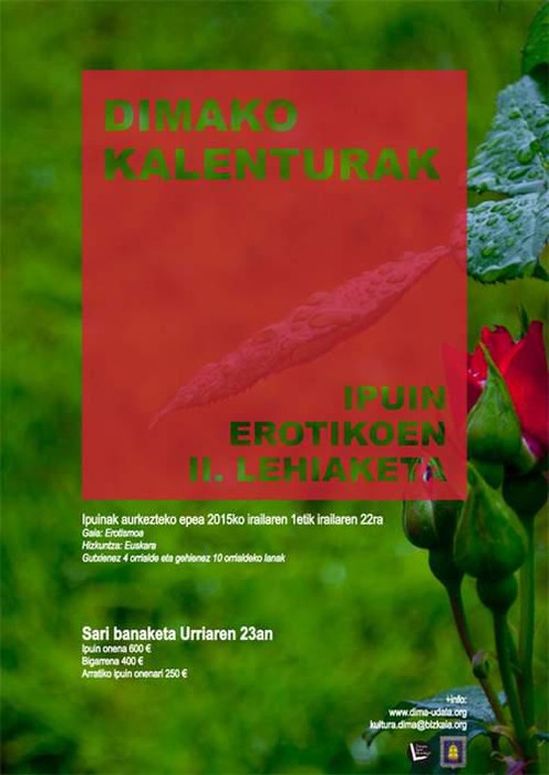 Dimako Kalenturak ipuin erotikoen II. lehiaketan parte hartu nahi dauenak, Udalera bialdu behar dau bere idazlana, posta arruntez zein elektronikoz, Kalenturak lehiaketarako dala adierazota. Hauxe da helbide elektronikoa: kultura.dima@bizkaia.org