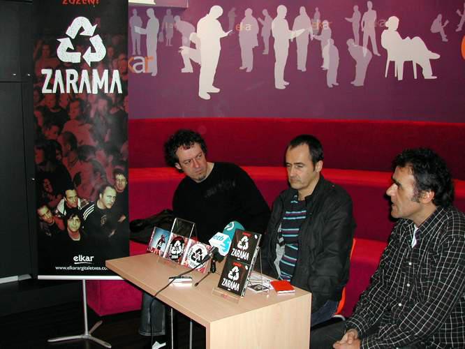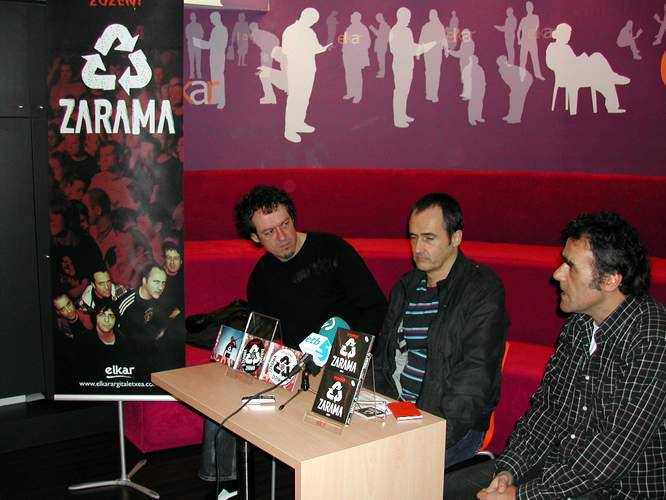 2009-11-26 14:32 Musikea'Zarama Zuzen!' CD-DVDa aurkeztu dabe gaur Bilbon Joseba eta Roberto taldekideek. Taldearen ikur diran kantuetako asko jaso ditue (Kostako bidea, Bostak bat, Dena ongi dabil, Gasteizko gaua...) eta hiru bertsino, horreetako bat Eskorbutoren 'Eskizofrenia', hain zuzen be.