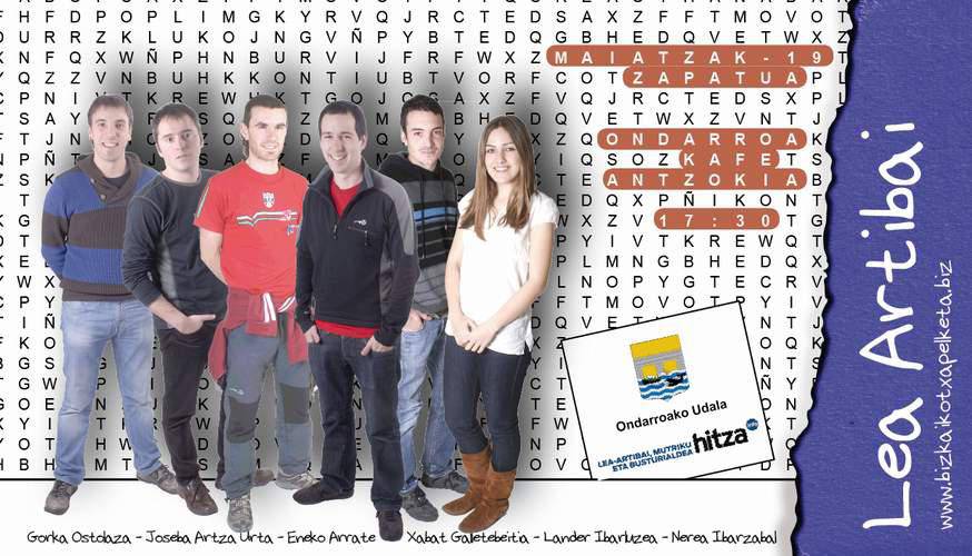 Eskualdeetako Bertsolari Txapelketea. Lea Artibai eskualdea. Bertsolariak: Gorka Ostolaza 'Potxis' + Joseba Artza 'Urta' + Eneko Arrate + Xabat Galletebeitia + Aitor Arrizubieta 'Toko' + Nerea Ibarzabal