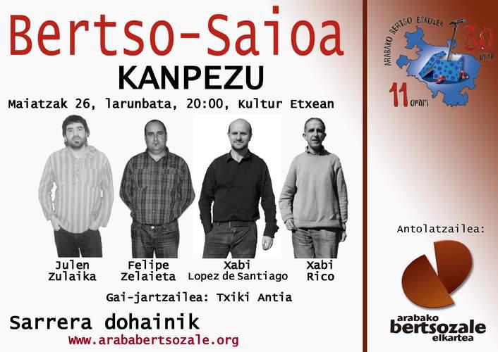 Arabako bertso eskolek 30 urte 11 opari. Bertsolariak: Julen Zulaika, Xabi Lopez de Santiago, Xabi Rico eta Felipe Zelaieta. Gai-jartzailea: Fernando Antia Txiki.