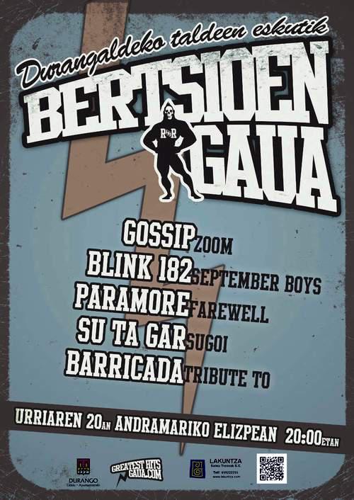 BERTSIOEN GAUA Durangaldeko taldeen eskutik. GOSSIP - Zoom + BLINK 182 - September Boys + PARAMORE - Farewell + SUTAGAR - Sugoi + BARRICADA - Tribute to