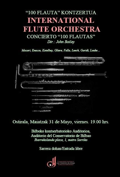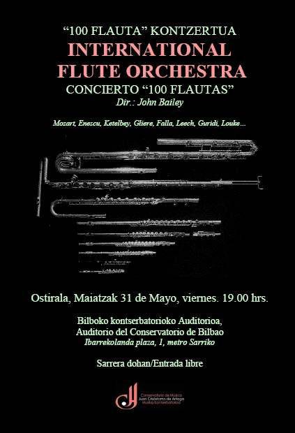 Bilboko konserbatorioko Auditorioan (Ibarrekolanda Plaza, 1 - Sarriko) | Musikea100 Flauta Kontzertua. International Flute Orchestra + Euskal herriko beste 60 flautista. Zuz.: John
