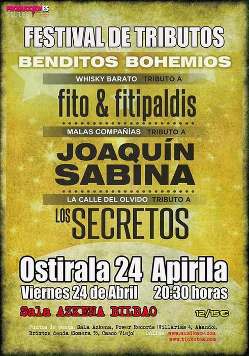 Tributo Gaua. WHISKY BARATO (Fito & Fitipaldisen omenez) + MALAS COMPAÑIAS (Joaquin Sabinaren omenez) + LA CALLE DEL OLVIDO (Los Secretosen omenez)