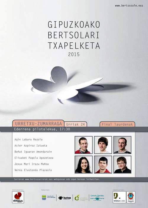 Gipuzkoako Bertsolari Txapelketea. Final laurenak. Agin Laburu, Asier Azpiroz, Beñat Iguaran, Elixabet Pagola, Jexux Mari Irazu eta Nerea Elustondo