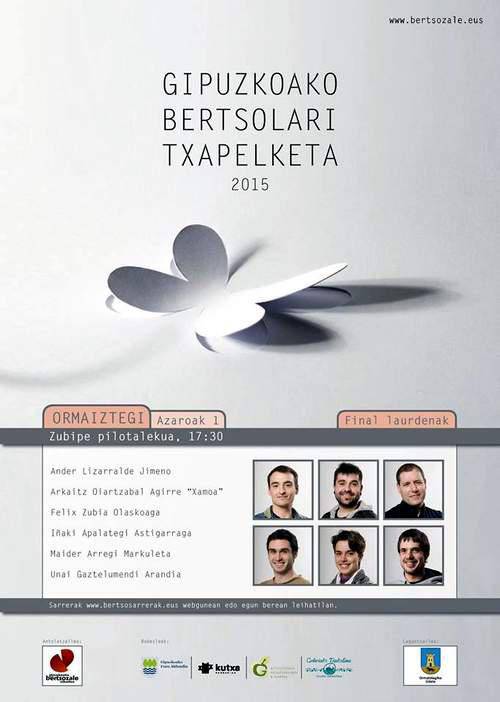 Gipuzkoako Bertsolari Txapelketea. Final laurenak. Ander Lizarralde, Arkaitz Oiartzabal Xamoa, Felix Zubia, Iñaki Apalategi, Maider Arregi eta Unai Gaztelumendi.