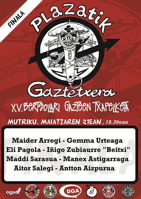 XV. Plazatik Gaztetxera. Finala. Bertsolariak: Eli Pagola eta Iñigo Zubiaurre Beitxi; Aitor Salegi eta Antton Aizpurua; Gemma Urteaga eta Maider Arregi; eta Manex Astigarraga eta Maddi Sarasua.