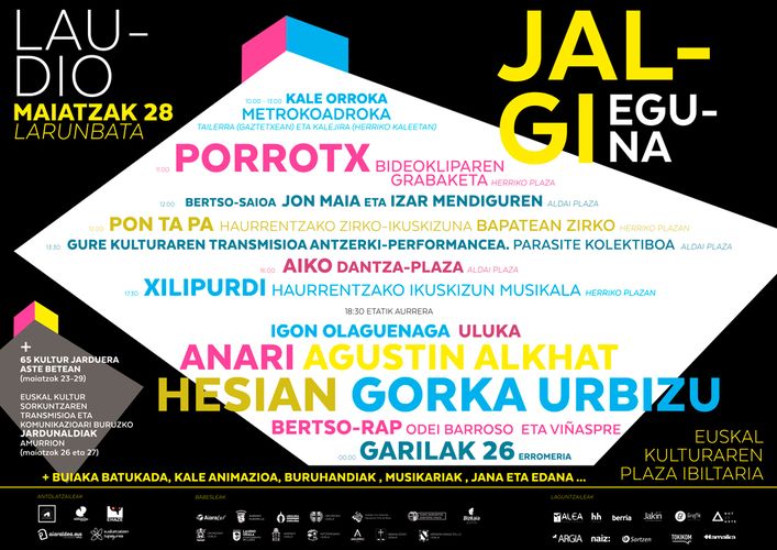 JALGI, euskal kulturearen plaza egitasmoa, gure kulturearen historia, egungo egoerea eta etorkizunekoa erakutsi, hausnartu, eztabaidatu eta bermatzeko sortutako egitasmo kolektiboa. Egitaraua eta informazino gehiago hemen.