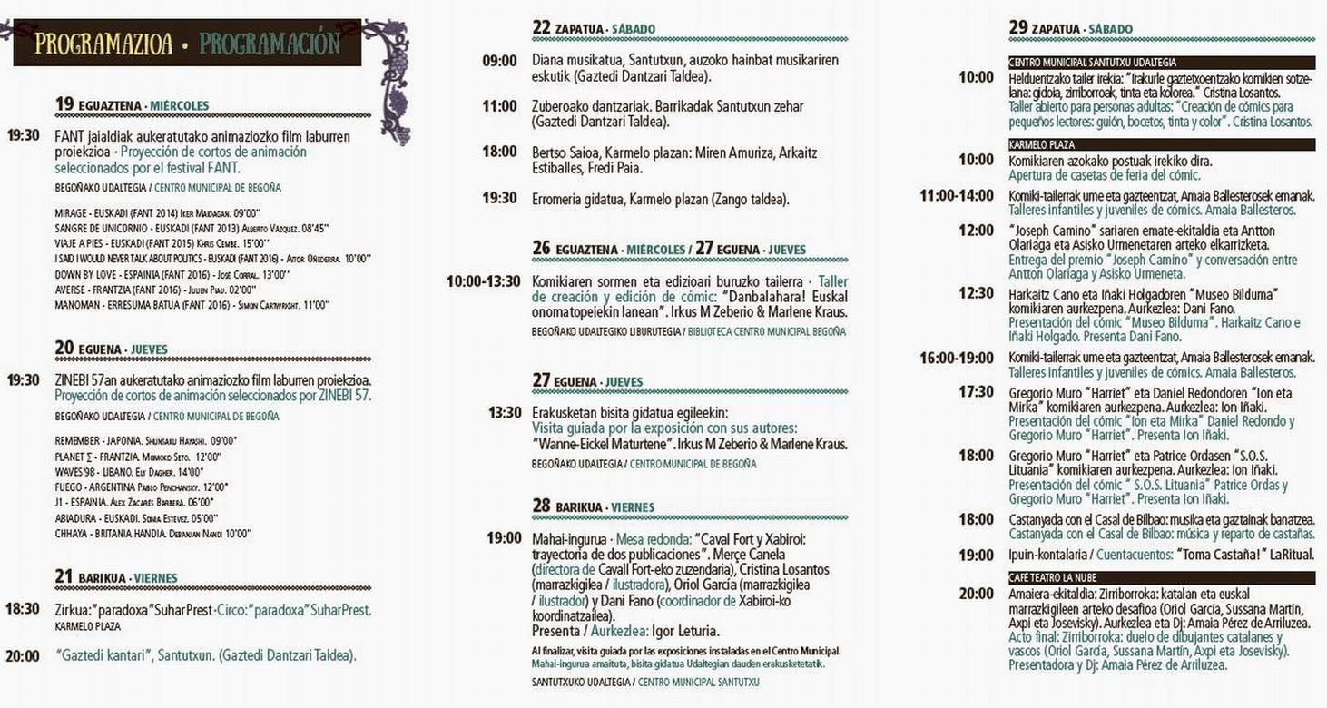 Urriaren 26an eta 27an, Begoñako liburutegian, komikien sorkuntzeagaz eta edizinoagaz lotutako tailerra antolatuko dabe Danbalahara! Euskal onomatopeiekin lanean izenburupean. Santutxuko udaltegian, ostera, mahai-ingurua entzun ahal izango da hilaren 28an. Cavall Fort aldizkariko zuzendari Merce Canelak, Cristina Losantos ilustratzaileak, Oriol Garcia ilustratzaileak eta Dani Fano Xabiroi aldizkariko koordinatzaileak egingo dabe berba, Igor Leturia moderatzaile dala. Helduentzako tailer edegia be emongo dau Cristina Losantosek 29an.