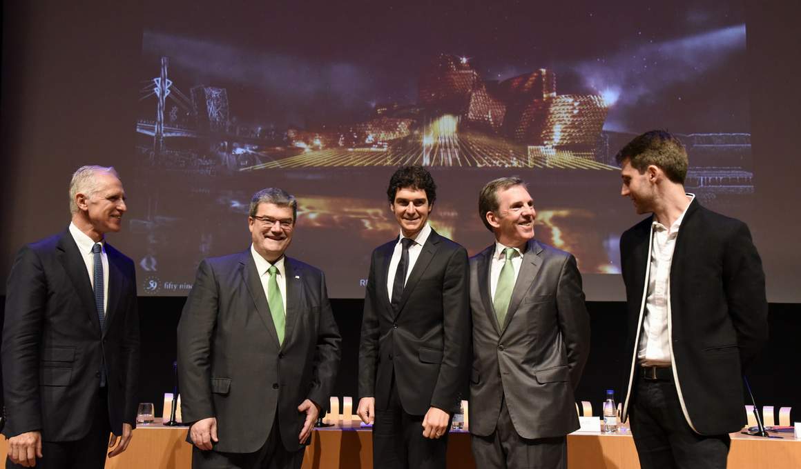 Leo Warnerregaz eta Juan Ignacio Vidartegaz batera, Unai Rementeria Bizkaiko Ahaldun Nagusia, Juan Mari Aburto Bilboko alkatea eta Asís Canales Iberdrolako ordezkaria egon dira Reflections aurkezteko ekitaldian. Izan be, Udala, Bizkaiko Foru Aldundia eta Iberdrola dira ikuskizunaren babesleak.