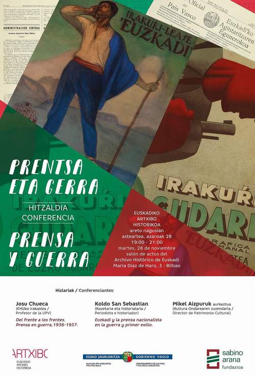Prentsa eta Gerra izenburupean Euskadiko Artxibo Historikoak eta Eusko Jaurlaritzako Kultura eta Hizkuntza Politika Sailak jardunaldiak atondu ditue. Koldo San Sebastian kazetari eta historialariak eta Josu Chueca Euskal Herriko Unibersidadeko (UPV/EHU) irakasleak berbaldi bana eskainiko dabe (arratsaldeko 19:00etatik aurrera); Del frente a los frentes. Prensa en guerra, 1936-1937’ izango da Chuecaren berbaldiaren izena, eta Euzkadi y la prensa nacionalista en la Guerra y el primer exilio izango da San Sebastianek eskainiko dauen berbaldia. Helburua da Gerra Zibila hasi baino lehenagoko hedabideen testuingurua azaltzea, batez be, Euzkadi eta El Liberal egunkarien kasua aztertuz. Bilbo menpean geratu eta gero, Frankismoak errotik erauzi eban prentsa libreak gurean izandako loraldia. Ordutik 80 urte igaro diranean, ezinbestekoa da zuhaitz sendo harek emondako fruituak gogora ekartea. Abertzaletasuna, ezkerra eta errepublikanismoa gurean zabaldu ziran, besteak beste,, prentsa herrikoi eta dinamikoaren garapenari esker, azaldu dabe antolatzaileek.