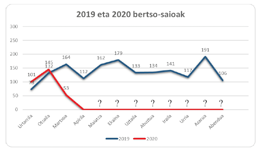 Udabarria indartsua izaten da, baina martian gauzak guztiz okertu ziran. Igazko martiko 164 saioen aldean, aurtengoan 53 baino ezin izan ziran egin. Apiriletik aurrera, kopurua zerora bajatu da (online saioak kontetan ez badira), eta etena luzerako joan leiteke. Bertsozale Alkartearen arabera, 385.000 euroko galerak egongo dira.
