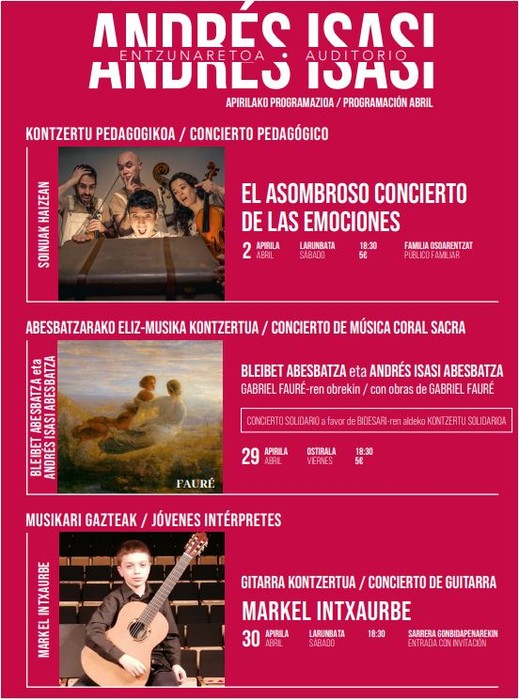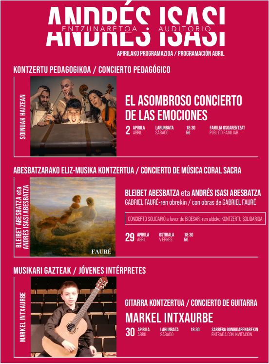 Kontzertu sakro-solidarioa, Bidesari-ren alde eta, bertan, Bleibet Abesbatza (Artziniega) eta Andrés Isasi (Getxo) abesbatzak joko dabe Gabriel Fauréren obra erlijiosoak oinarri hartuta. Sarrerak 5 euroan egongo dira salgai, leihatilan, egun berean (16:30etik aurrera).