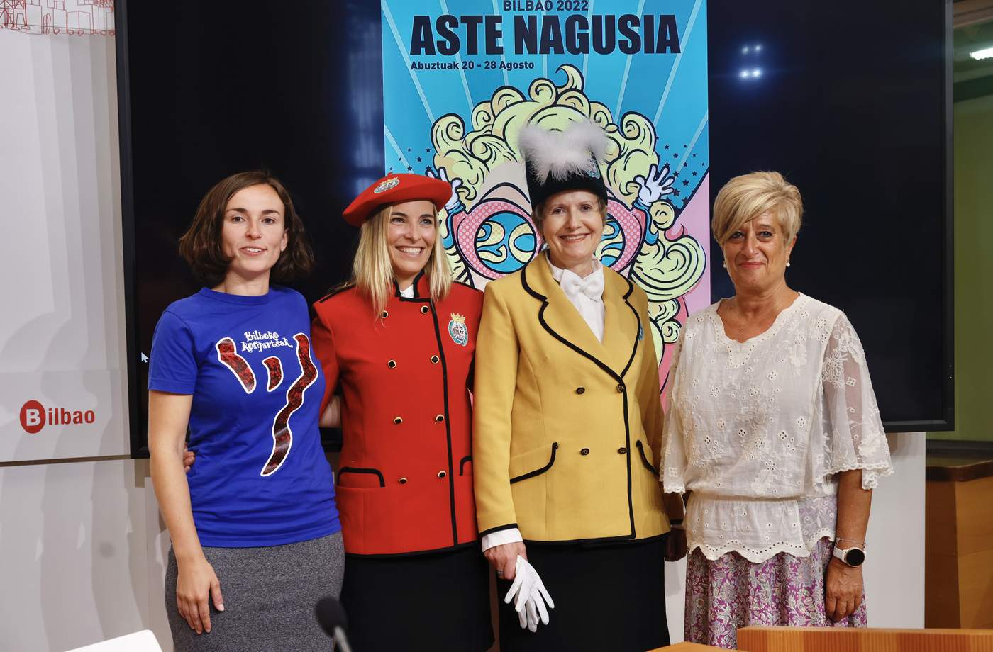Bilboko udaletxean eta euren karguei jagokezen jantzi bereziak soinean, agerraldia egin dabe 2022ko Bilboko Aste Nagusiko txupinera Iratxe Palaciosek eta pregoilari Itziar Lazkanok. Jai Batzorde Mistoaren izenean, ekitaldian izan dira Udaleko zinegotzi Itziar Urtasun eta Bilboko Konparsetako Garazi Askasibar.