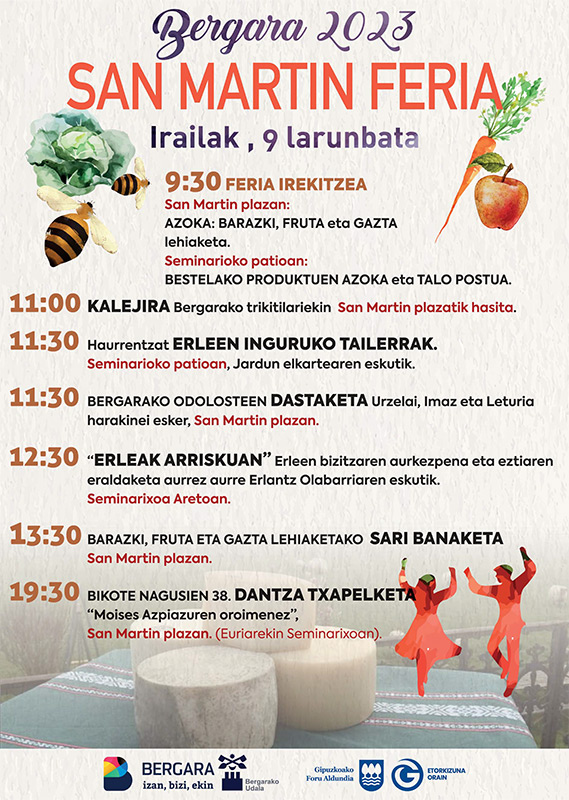 - 09:30: Azokea: Barazki, fruta eta gazta lehiaketea. San Martin plazan. Bestelako produktuen azokea eta talo postua. Seminariako patioan.