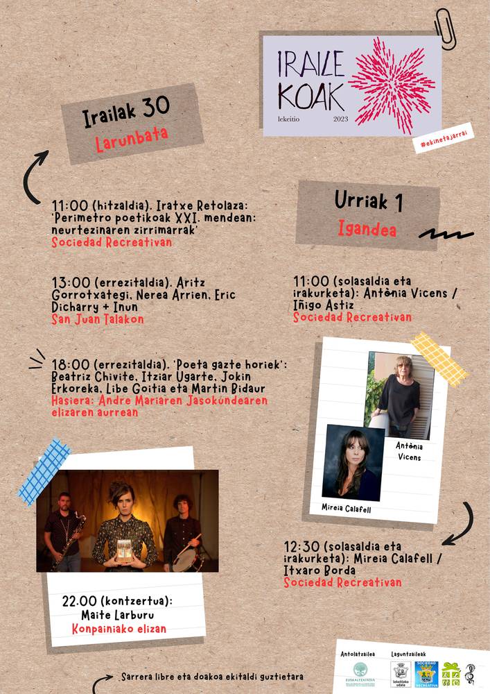 - 13:00etan (errezitaldia): Aritz Gorrotxategi, Nerea Arrien eta Eric Dicharry + Inun musikaria (San Juan Talakon).