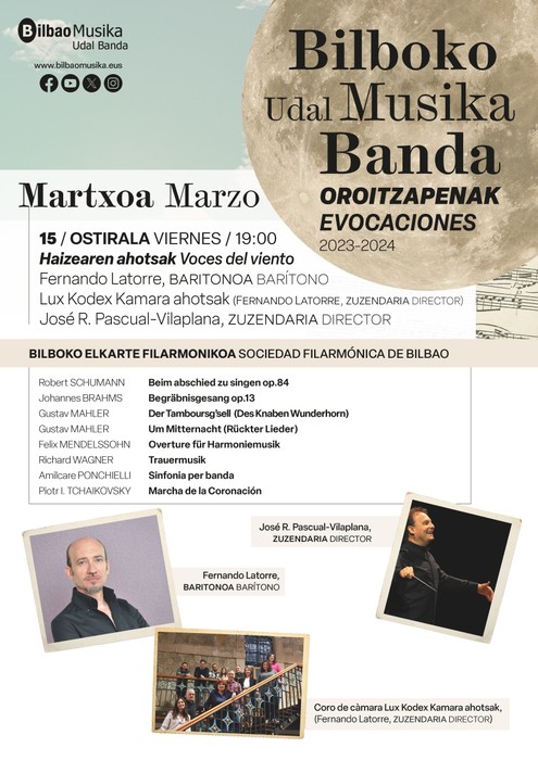 Bilboko Udal Musika Bandea 1896an sortutako Bilboko Alkarte Filarmonikoaren Aretoan estreinauko da. José R. Pascual-Vilaplanaren gidaritzapean eta Fernando Latorre baritonoagaz eta Lux Kodex Kamara abesbatzagaz batera (Latorrek berak zuzendua).