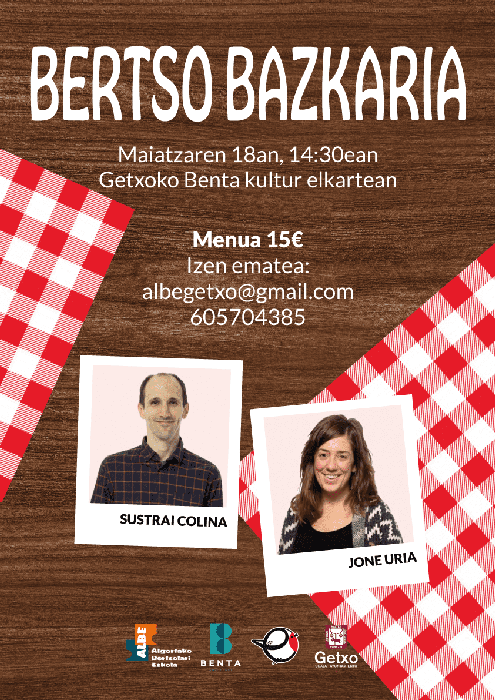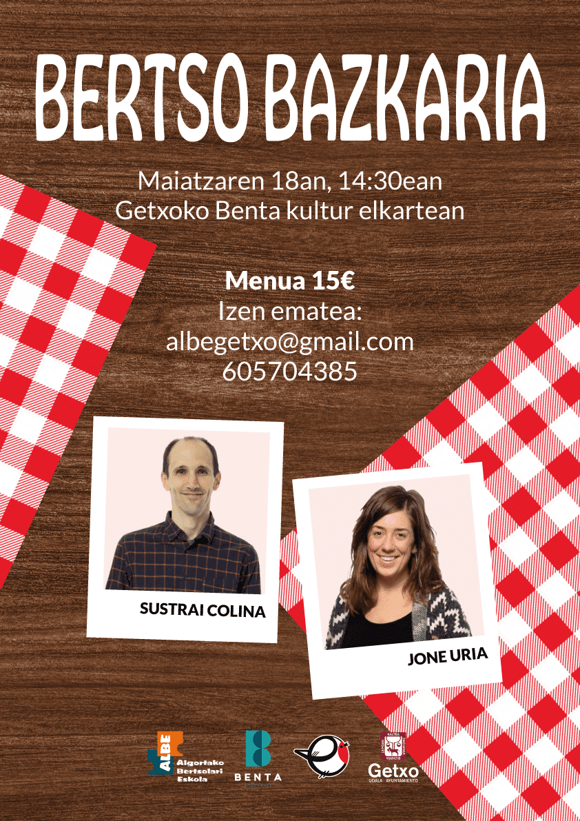 Maiatzaren 18an, zapatuan, Euskal Herriaren mutur biak batuko ditue mahaiaren bueltan, Sustrai Colina urruñar iruindartuaren eta Jone Uria algortarraren bertsoak lokarri dirala. Getxoko Benta kultur alkartearen lokal zaharberrituan bazkalduko dabe, Aritz Landeta bertako partaide eta ALBEkidearen bitartekaritzeari esker.