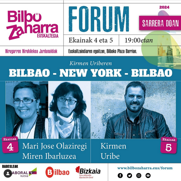 Hiruilabete honetako Bilbo Zaharra Forumeko jardunaldiak Kirmen Uriberi eskeiniko deutsee, Bilbao-New York-Bilbao: Euskal literatura nazinoartean jardunaldiegaz.