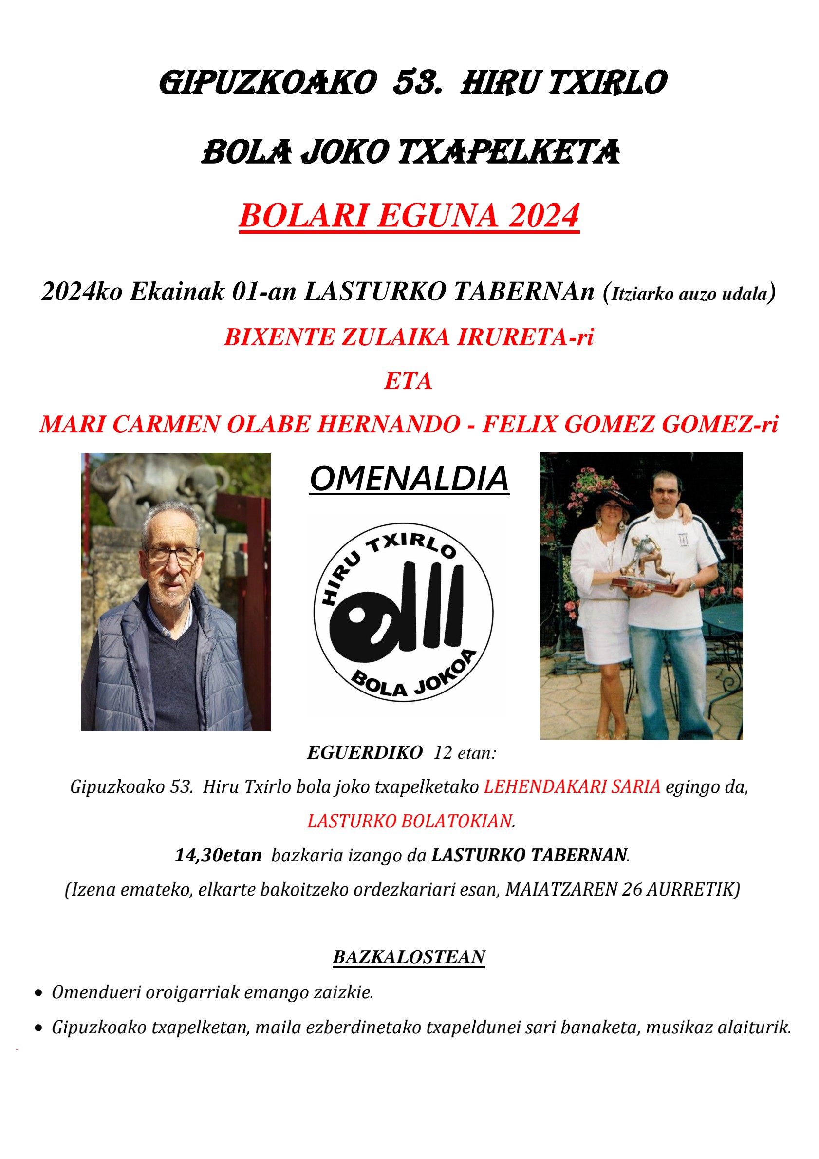 Lasturko Tabernan. | Txapelketak53. Gipuzkoako Hiru Txirlo Bolo Joko Txapelketea. BOLARI EGUNA
