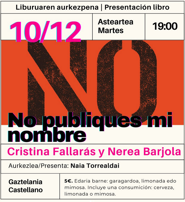 Bilboko La Sinsorga Kulturgune Feministan. | Aurkezpenak'No publiques mi nombre'. CRISTINA FALLARÁS & NEREA BARJOLA