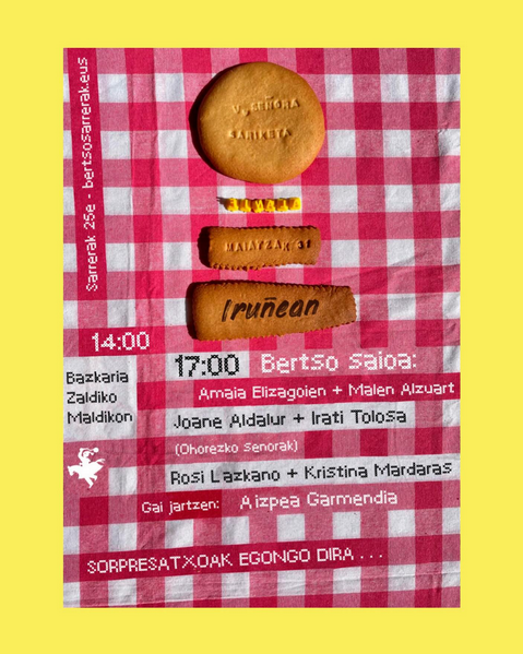 Bertsolariak: Amaia Elizagoien eta Malen Alzuart; Joane Aldalur eta Irati Tolosa; Ohorezko señorak, Rosi Lazkano eta Kristina Mardaras. Gai-jartzailea, Aizpe Garmendia. Sorpresak egongo dira.