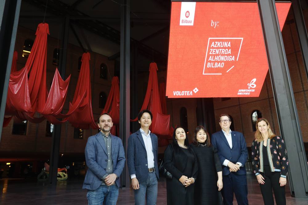 Gonzalo Olabarria Bilboko Udaleko Kultura eta Gobernantza zinegotziak, Chiharu Shiota artisteak eta Tereza de Arruda erakusketearen komisarioak aurkeztu dabe erakusketea, 2025eko irailaren 28ra arte edegita egongo dana.