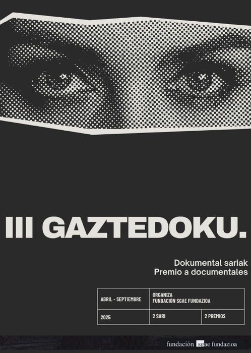 Euskadiko SGAE Fundazinoaren III. Gaztedoku 2025 Sariak ZINEBIren 67. edizinoan proiektauko ditu, hau da, Bilboko Dokumentalen eta Film Laburren Nazinoarteko Jaialdian, zemendiaren 21etik 28ra. Errepertorio zehatz honen zabalkundea bermatzea da asmoa, Zinebiko zuzendaritzeagaz oraintsu adostuta. Era berean, deialdiak aurreikusitako diru-kantidadeei eusten deutse: 2.500 euro dokumental onenari eta 1.500 euskeraz egindako lan onenari. Kasua bada, euskal ikus-entzunezkoen sektoreko hainbat profesionalek osotutako epaimahaiak 1.000 euroko aitamen berezi bat be emon ahal izango dau. Bide batez, obra irabazleak hautatuak diranetik aurrera, programau daitekez bai SGAEk bai Fundazinoak Estadu mailan dituan egoitzatan be.