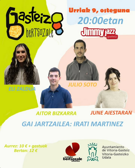 Bertsolariak: Eli Zaldua, Julio Soto, Aitor Bizkarra eta June Aiestaran. Gai-jartzailea: Irati Martinez.