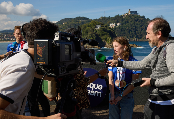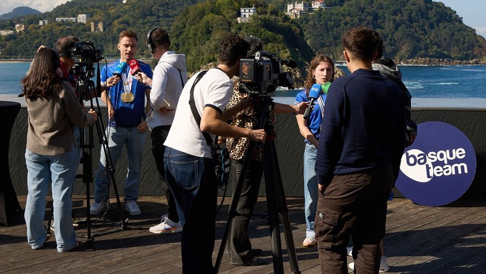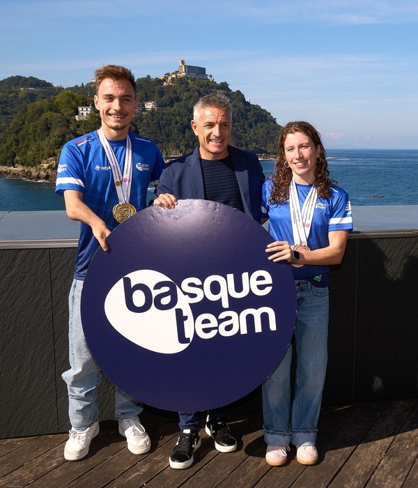Iñigo Llopis eta Nahia Zudaire Basque Team Fundazinoaren bekea daben ugerlariei harrerea egin deutse Donostian Gorka Iturriaga Eusko Jaurlaritzako Jarduera Fisikoaren eta Kirolaren zuzendariak. Ondoetorri ekitaldira batu dira Olatz Legarza Basque Team Fundazinoko koordinatzailea, baita euren adierazpenak jaso nahi izan dituen komunikabide ugari be.