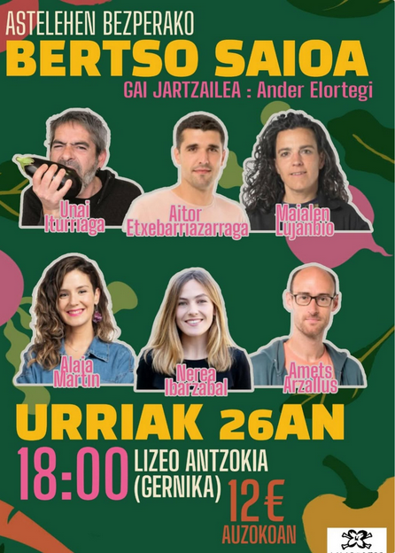 Bertsolariak: Unai Iturriaga, Aitor Etxebarriazarraga, Maialen Lujanbio, Alaia Martin, Nerea Ibarzabal eta Amets Arzallus. Gai-jartzailea: Ander Elortegi. Sarrerak Auzokoan salgai 12 euroren truke.