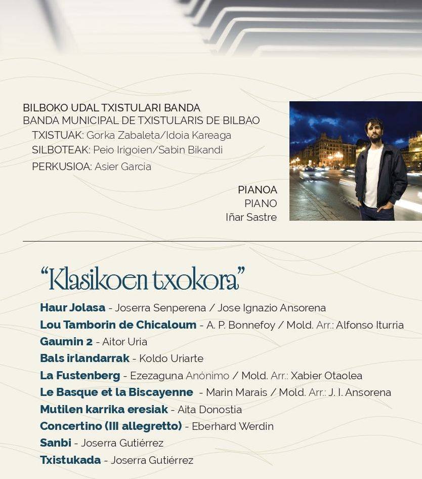 1980ko hamarkadatik pedagogiaren arloan oso presente egon dan txistu eta piano formazinoa omentzeko proposamena da. Bilboko Udal Txistulari Bandeak Iñar Sastre pianistea izango dau lagun,