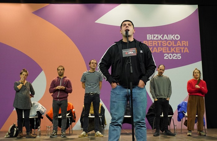 Markina-Xemeingo Uni frontoian izan da Bizkaiko Bertsolari Txapelketako finalaren aurreko azken geltokia. Bosgarren finalaurrekoa izateaz gan, badakigu finalean kantauko dabenen zerrendea. Kanpoan hotz, baina ia 700 lagun frontoi barruan eta giroa bero, sei lagun honeek kantau dabe bertsozaleentzako: