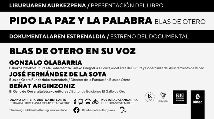 Abenduaren 2an, martitzenean, 19:00retan, Bilboko Udaleko Bidebarrieta Kulturgunean Pido la paz y la palabra"Blas de Otero poeta bilbotarraren poesia liburuaren aurkezpena egingo da, bere lehen argitalpenaren 70. urteurrena dala eta. Gainera, ekitaldian zehar, Blas de Otero en su voz dokumentala erakutsiko da, Blas de Otero Fundazinoaren artxiboko argitaratubakoa eta birmasterizautako grabazinoakaz egina.