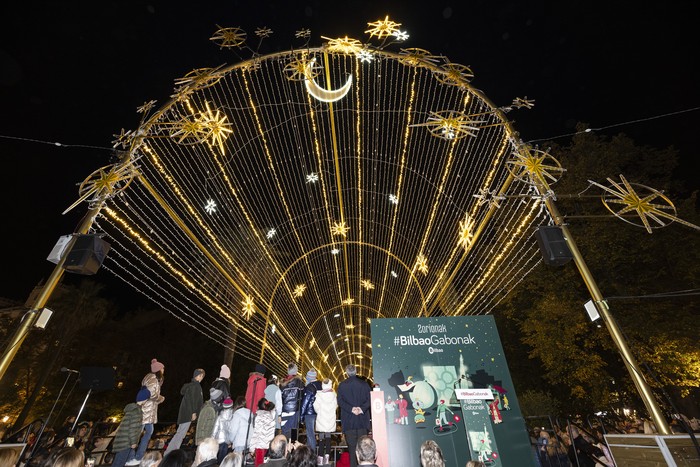 Bilboko Alkateak, Juan Mari Aburtok, atzo, zemendiak 26, sakatu eban botoi gorria Gabonetan uriko auzo guztiak argiztatzeko. Casilda Iturrizar parkeko pergolan izan zan, 70 metro luze dan soinu eta argi-tunelaren ondoan.