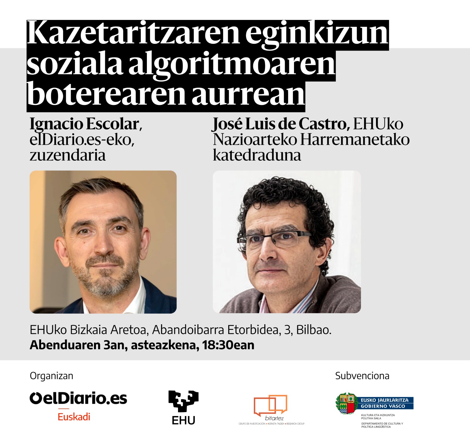 Hizlariak: Ignacio Escolar (elDiario.es egunkariaren zuzendaria) eta Jose Luis de Castro (EHUko Nazinoarteko Hartu-emonetako katedraduna).
