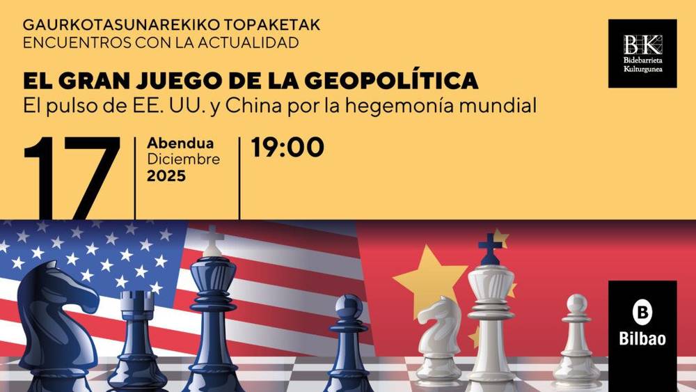 Bilboko Udaleko Bidebarrieta Kulturguneak Gaurkotasunagaz Topaketak zikloaren beste hitzordu bat hartuko dau gaur, abenduak 17an, eguaztena, arratsaldeko 19:00retan. Jardunaldiaren izenburua El gran juego de la geopolítica - El pulso de Estados Unidos y China por la hegemonía mundial da. Bertan, Borja Maciasek, Euskal Herriko Unibersidadeko Zientzia Politikoetan doktore eta geopolitikan adituak, gaiari buruz dauen ikuspegia azalduko dau, eta Mikel Reparaz kazetariak moderauko dau topaketea.