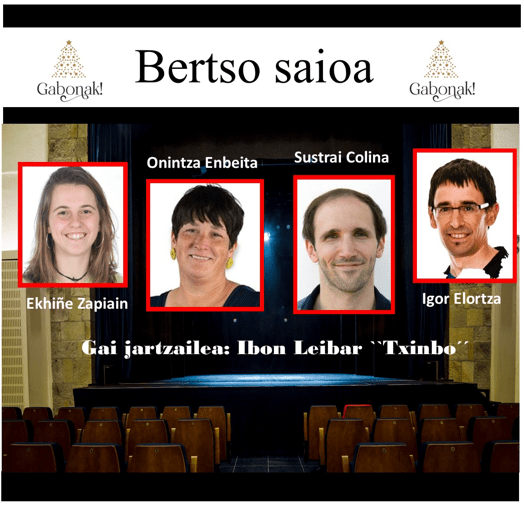 - Bertsolariak: Ekhiñe Zapiain, Onintza Enbeita, Sustrai Colina eta Igor Elortza.
