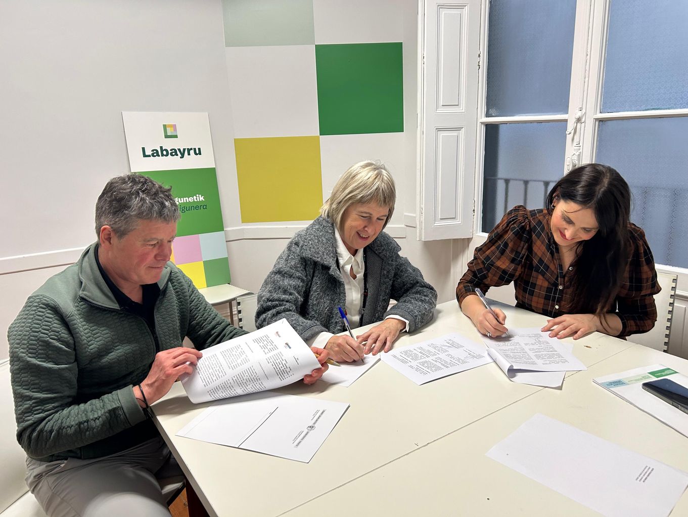 Aitor Aldasoro, Hizkuntza Politikako sailburuordea; Leixuri Arrizabalaga, Euskera, Kultura eta Kirol diputadua; eta Igone Etxebarria, Labayru Fundazinoko zuzendaria izan dira, alkarlanerako oinarri orokorrak ezartzen dituan esparru-hitzarmena sinatzeko eitaldian.