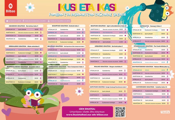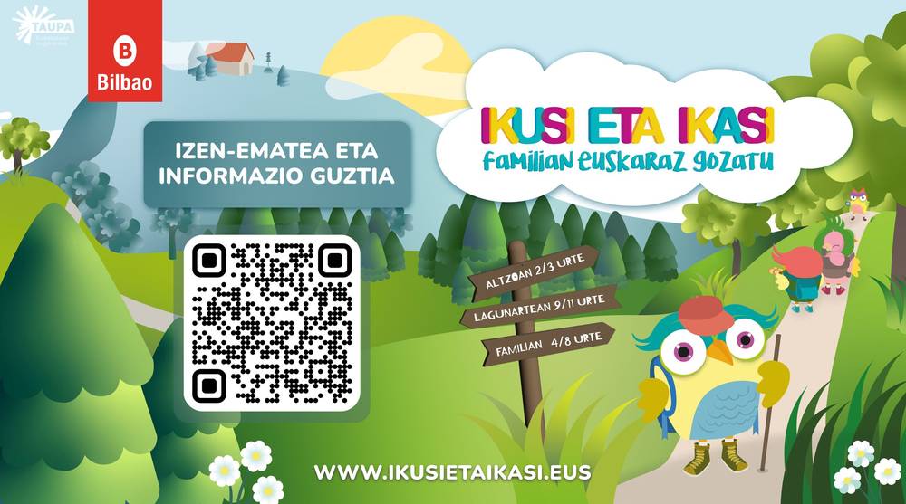Bilboko Udalak Ikusi eta Ikasi udal-programan izena emoteko epea edegi dau gaur. Programa horrek uriko auzo guztietan euskerazko aisialdia familian gozetako aukerea emoten dau. Zezeiletik maiatzera egiten da. Danetara, 64 jarduera atondu ditue: Altzoan, olgeta eta abesti saioak, 0 eta 1 urte bitarteko umeentzat -gurasoakaz batera-; eta Familian, sormen-tailerrak 2 eta 9 urte bitarteko umeentzat, honeek be familiartekoaz batera.