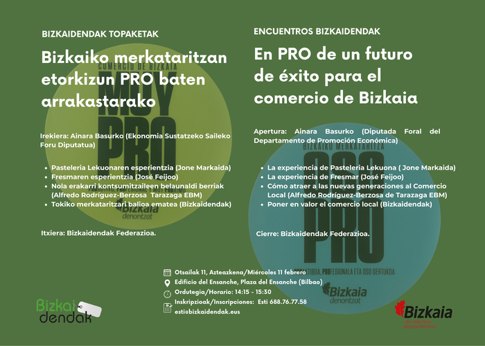 Hitzaldi horretan, merkatariek euren esperientzia arrakastatsuak kontauko ditue. Egitasmoa Bizkaidendak Topaketak 2026 parte da, Bizkaiko Foru Aldundiaren Bizkaiko Merkataritza OSO PRO kanpaineagaz bat etorriz.