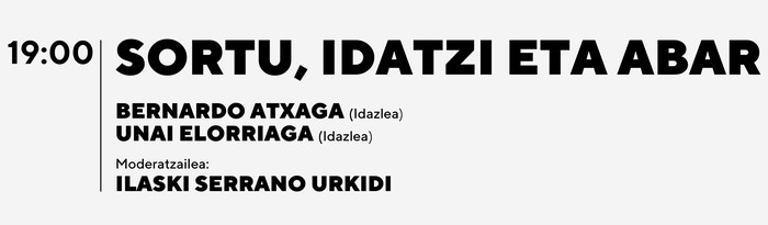 Bilboko Udaleko Bidebarrieta Kulturguneak Eztabaidak Literatureagaz XXI. Mendean programan beste hitzordu bat izango da, zezeilaren 17an, Sortu, idatzi eta abar izenburupean, Bernardo Atxaga eta Unai Elorriaga idazleek hartuko dabe parte barriketaldian, Ilaski Serrano Urkidi kazetariaren moderazinoagaz.