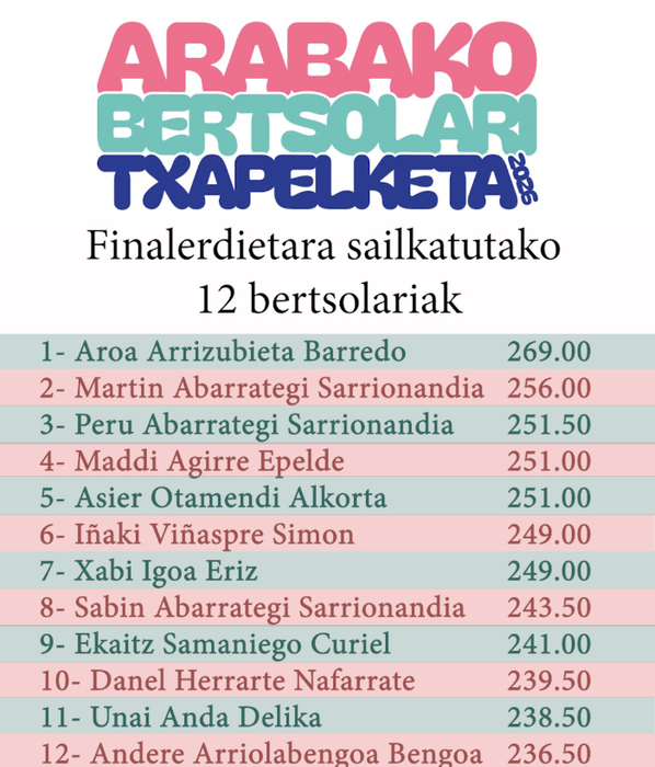 Finalerdietara sailkatutako 12 bertsolariak