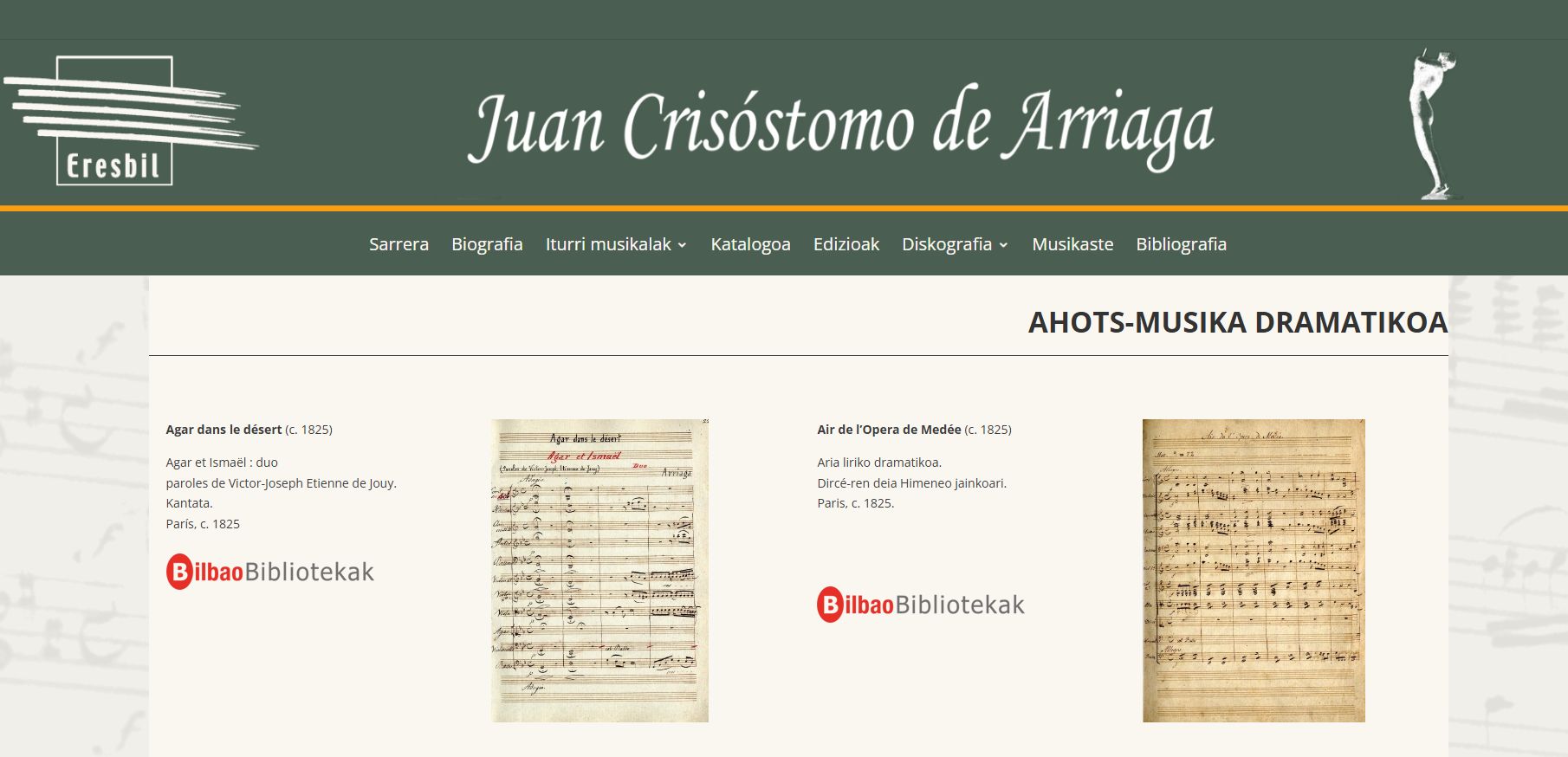 Eresbil – Musikearen Euskal Artxiboak, Bilboko Udalaren laguntzeagaz, webgune barri bat landu dau Juan Crisostomo de Arriaga (1806 – 1826) konpositore bilbotarra bere heriotzearen bigarren mendeurrenean gogoratzeko.