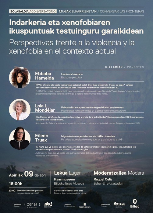 Horretarako, Lola L. Mondéjar izango da bertan, psikoanalista eta pentsamendu garaikidean erreferentea, eta 2024ko Anagrama saiakera-saria irabazi dauen Sin relato. Atrofia de la capacidad narrativa y crisis de la subjetividad lanaren egilea; Ebbaba Hameida idazlea, Flores de papel liburuaren egilea eta RTVEko kazetaria, Ukrainako gerra eta nazinoarteko beste gatazka batzuk landu dituana; eta Eileen Truax kazetaria, migrazinoetan espezializautakoa eta El muro que ya existe. Las puertas cerradas de Estados Unidos lanaren egilea, herrialde horretan lau hauteskunde presidentzial jarraitu dituana. Barriketaldia Raquel Celisek moderauko dau, nahitaezko desplazamenduan aditua eta Zehar-Errefuxiatuakaz erakundeko Deserrotuak lan-arloaren koordinatzailea.