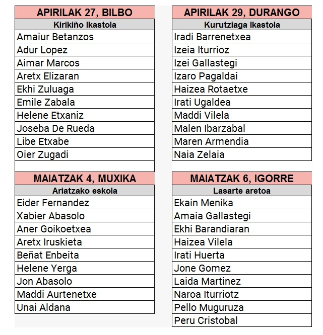 Bizkaiko ikastetxe eta eskualdeetan, apirilaren erditik eta maiatza osoan zehar hainbat idatzizko kanporaketa egingo dira Bizkaia osoan zehar. Kanporaketa horreetatik sailkatutako ikasleek idatzizko finaletan parte hartzeko aukerea izango dabe.