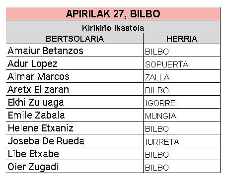 2026-04-29 07:45 BertsolaritzeaBilboko Kirikiño ikastolan batu ziran.