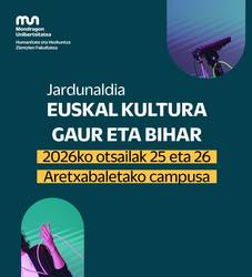 MUko Humanidade eta Hezkuntza Zientzien Fakultadeko Aretxabaletako campusean, IdeiEnea aretoan. |JardunaldiakJardunaldiak, zezeilaren 25an eta 26an izango dira. Aurrez hiru edizino izan dituan Euskal Kulturearen Eragiletza masterreko jardunaldiari jarraipena emongo deutse hemendik aurrera Euskal kulturea gaur eta bihar jardunaldiak.